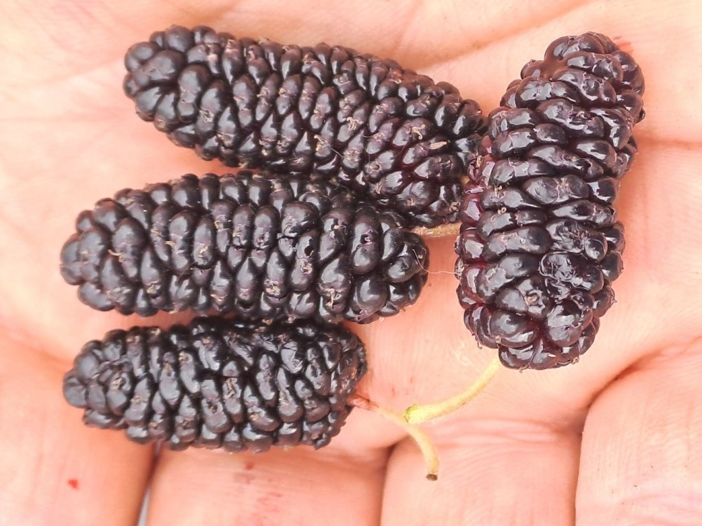 Moruše (Morus alba) – černoplodá -  ovocný strom či velký keř příbuzný fíkům, dorůstající 10–15 m, od léta nese plody tvarem podobné ostružinám, barvy černé, 2–4 cm velké, šťavnaté, nasládlé až sladkokyselé, velmi dobré chuti. Oblíbené jsou v čerstvém stavu nebo zpracované na kompoty, marmelády, víno, sirupy i sušené. Léčivé při zácpě, srdečních a cévních chorobách. Strom se hodí i pro větrolamy, netvarované živé ploty a aleje. Žádá teplou slunnou polohu, živnou hlubokou půdu, hodí se nižších a středních poloh, do vyšších jen na vhodná stanoviště. Semenáče bývají více mrazuodolné, plodí ale později než pravokořenné rostliny, nejdříve za 3-5 let po výsadbě.
